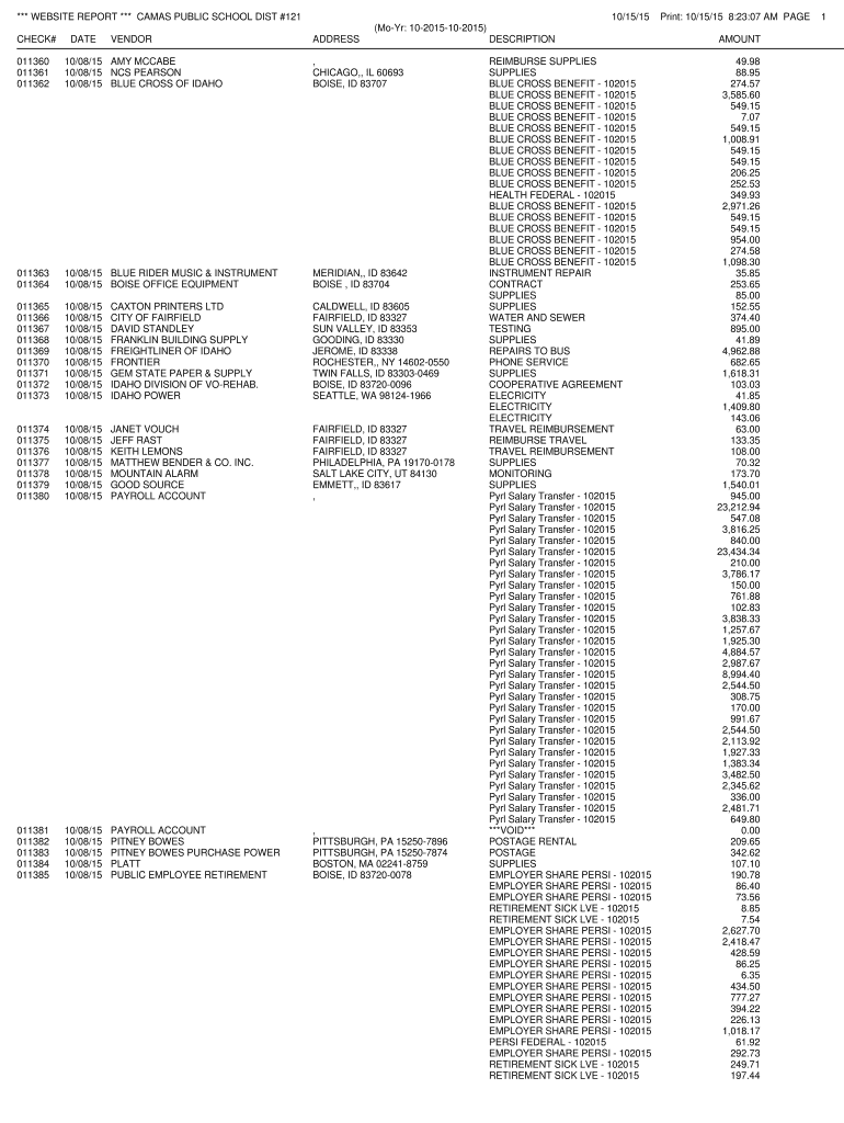 *** WEBSITE REPORT *** CAMPS PUBLIC SCHOOL DIST #121 10/15/15 Print: 10/15/15 8:23:07 AM PAGE (Moor: 102015102015) CHECK# DATE VENDOR ADDRESS DESCRIPTION AMOUNT REIMBURSE SUPPLIES BLUE CROSS BENEFIT