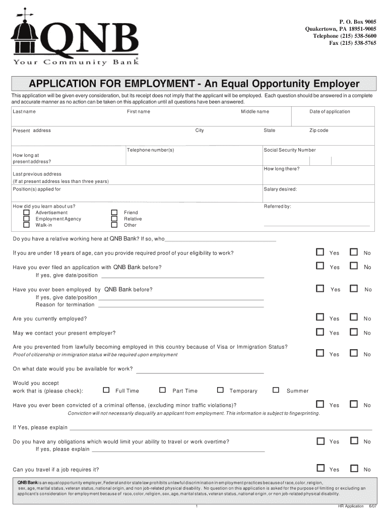 P. O. Box 9005 Quaker town, PA 189519005 Telephone (215) 5385600 Fax (215) 5385765 APPLICATION FOR EMPLOYMENT An Equal Opportunity Employer This application will be given every consideration, but