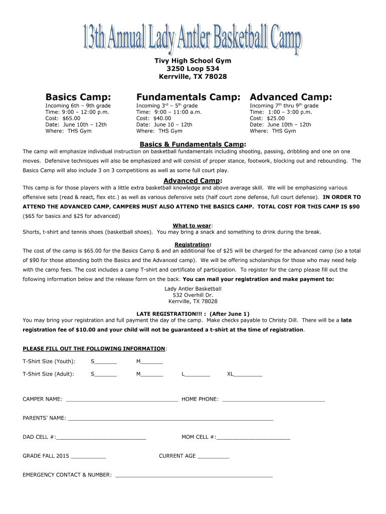 Tiny High School Gym 3250 Loop 534 Kerrville, TX 78028 Basics Camp: Fundamentals Camp: Advanced Camp: Incoming 6th 9th grade Time: 9:00 12:00 p.m. Cost: $65.00 Date: June 10th 12th Where: THS Gym