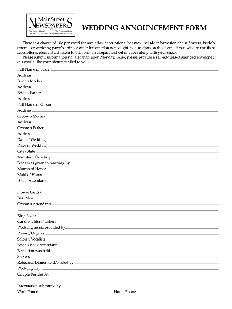 Mainstream NEWSPAPER S Inc. The Jackson Herald The Banks County News The Commerce News The Madison County Journal WEDDING ANNOUNCEMENT FORM There is a charge of 10 per word for any other descriptions