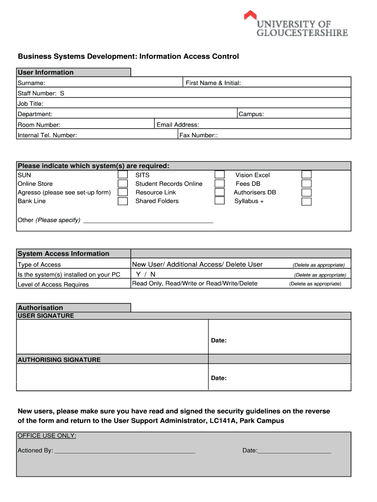 Business Systems Development: Information Access Control User Information Surname: First Name & Initial: Staff Number: S Job Title: Campus: Department: Email Address: Room Number: Internal Tel. Number: