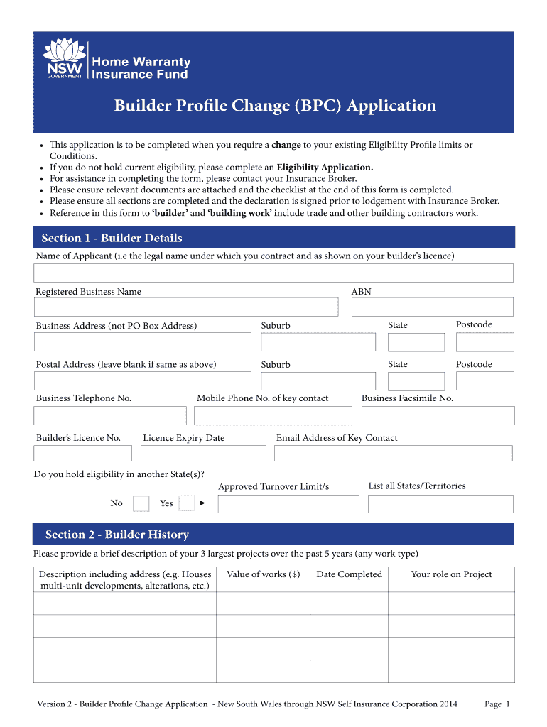 Home Warranty Insurance Fund Builder Profile Change (BPC) Application This application is to be completed when you require a change to your existing Eligibility Profile limits or Conditions. If you