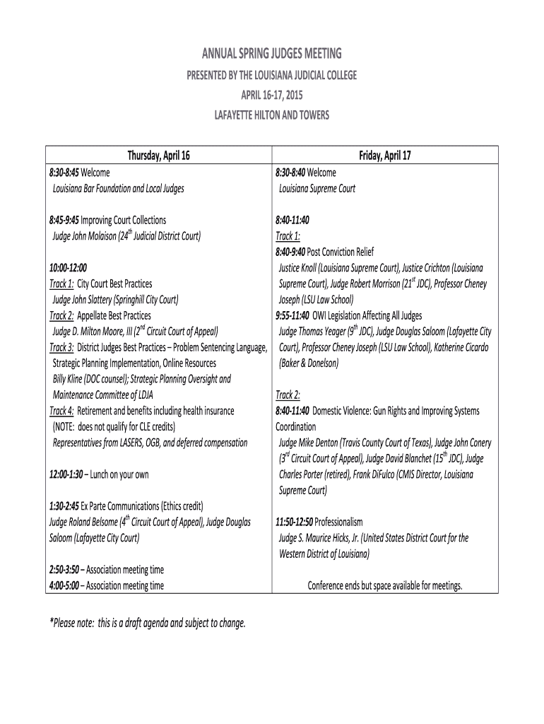 Get the free Annual spring judges meeting - The Louisiana Judicial College - lajudicialcollege