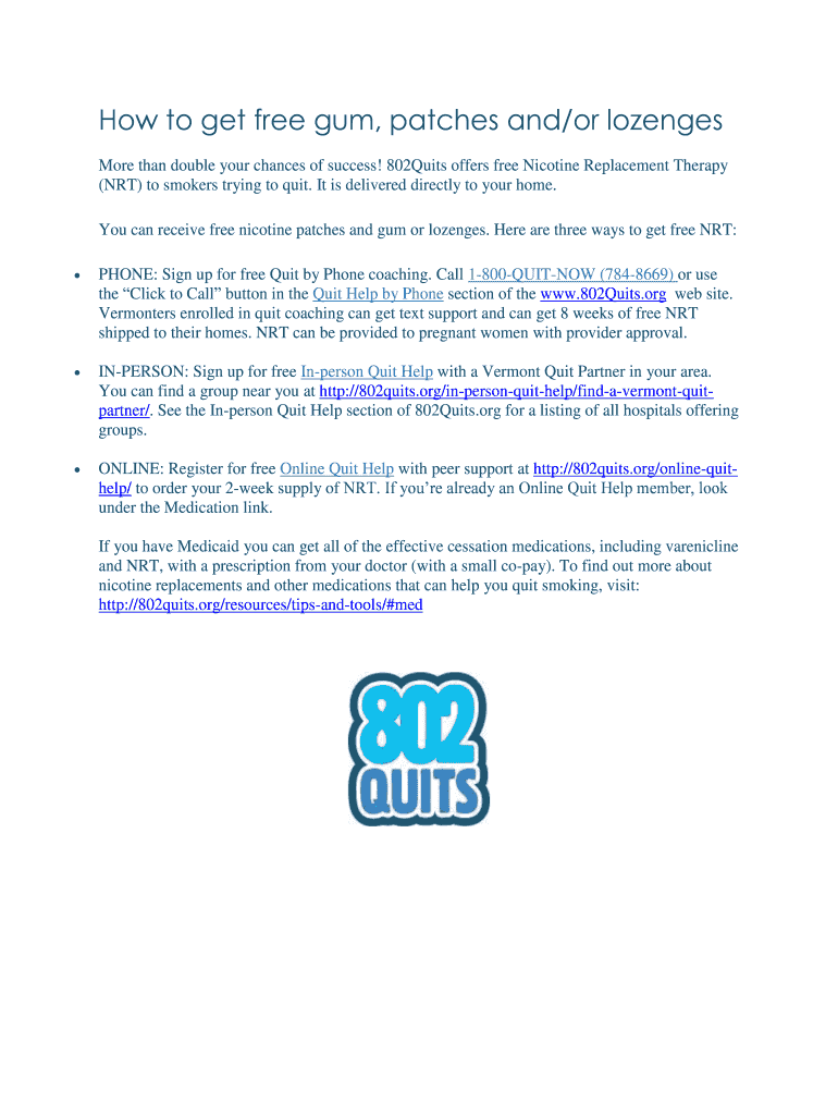 More than double your chances of success! 802Quits offers free Nicotine Replacement Therapy