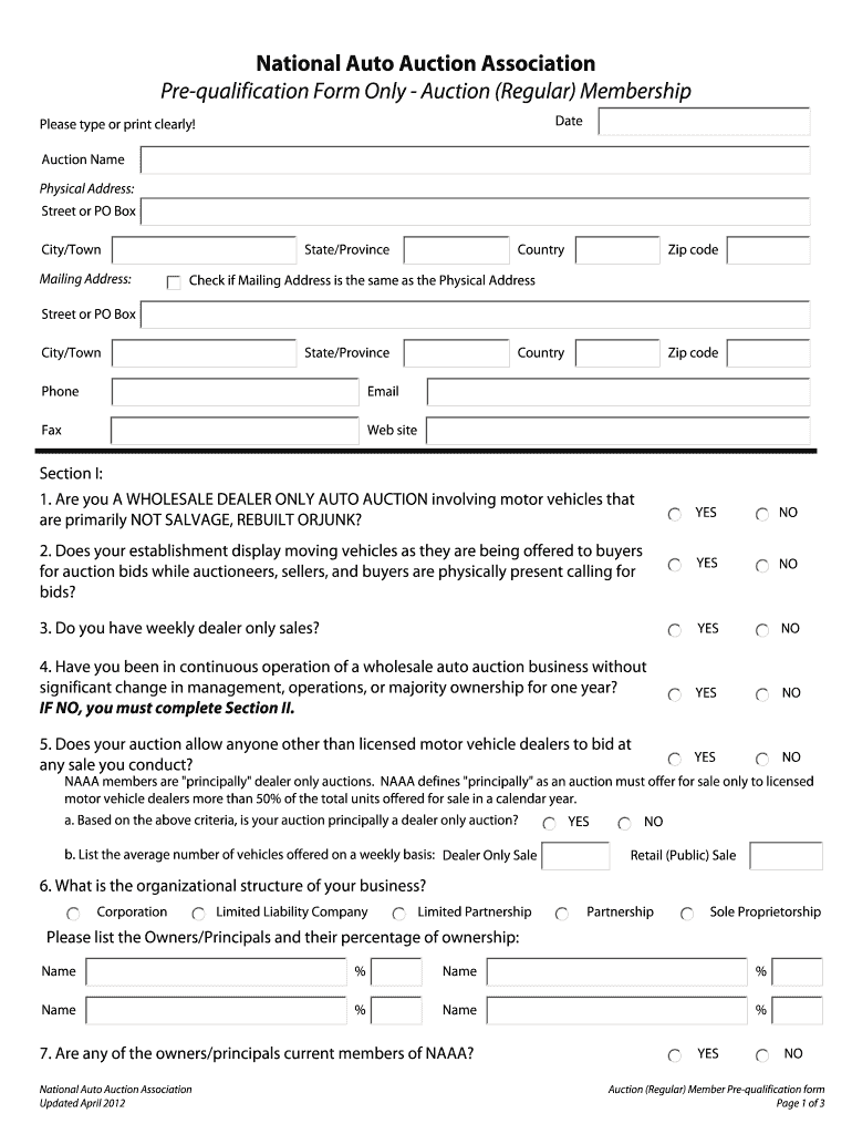 National Auto Auction Association Prequalification Form Only Auction (Regular) Membership Date Please type or print clearly! Auction Name Physical Address: Street or PO Box City/Town Mailing Address:
