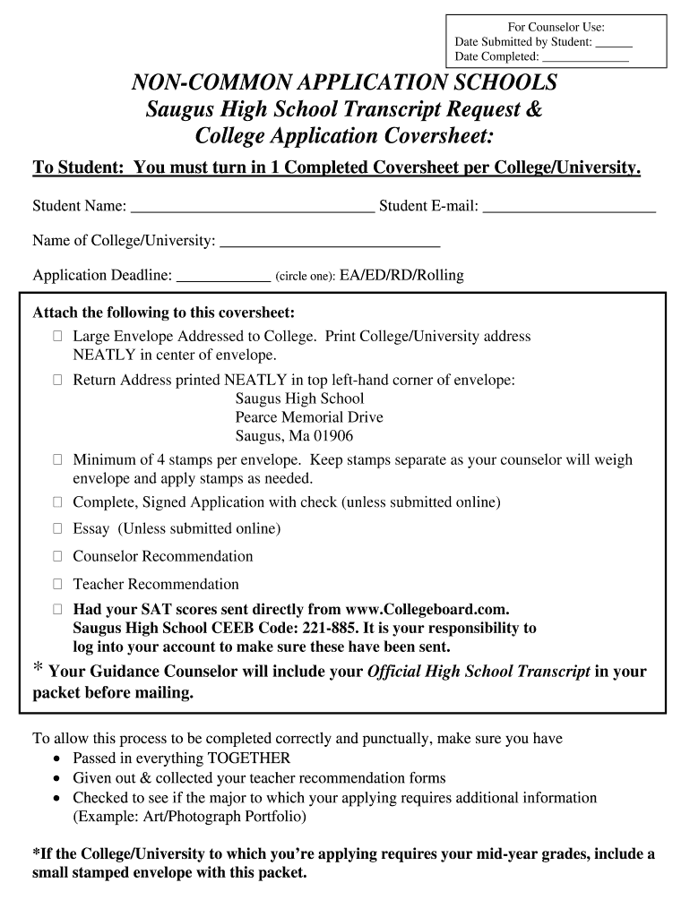 For Counselor Use: Date Submitted by Student: Date Completed: NONCOM MON APPLICATION SCHOOLS August High School Transcript Request & College Application Cover sheet: To Student: You must turn in 1