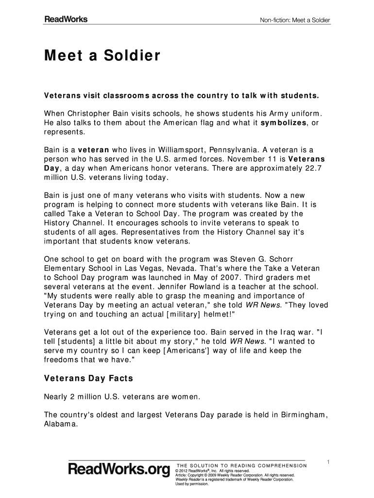 Nonfiction:Meet a Soldier Meet a Soldier Veterans visit classrooms across the country to talk with students. When Christopher Bain visits schools, he shows students his Army uniform. He also talks