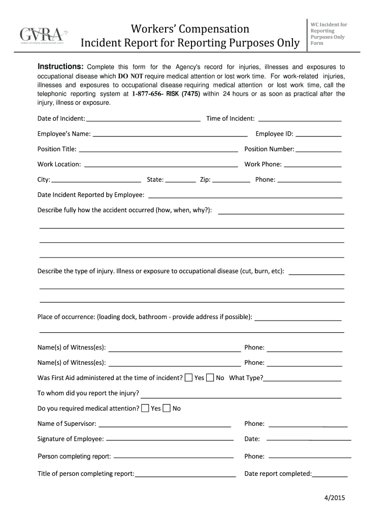 Workers Compensation Incident Report for Reporting Purposes Only WC Incident for Reporting Purposes Only Form Instructions: Complete this form for the Agency's record for injuries, illnesses and exposures