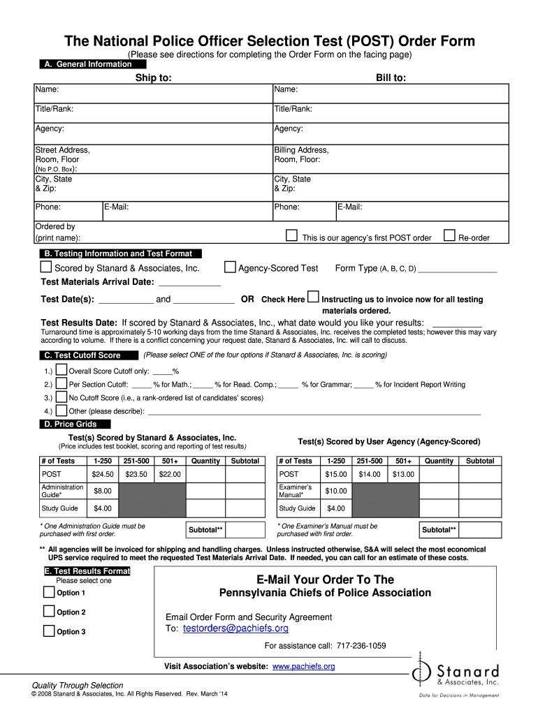 Order Form The National Police Officer Selection Test Selection System Selecting Tomorrows LeadersToday Quality Through Selection 2008 Standard & Associates, Inc. All Rights Reserved. Rev. March 14
