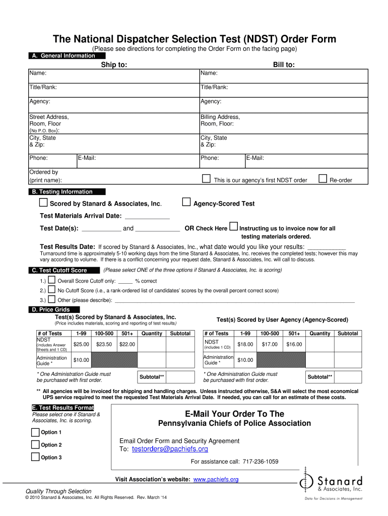 Dispatcher Selection Test Security Agreement and Order Form Dispatcher Selection Test 2010, Standard & Associates, Inc. All rights reserved. Rev. March 14 How to Complete Your Order Form Following