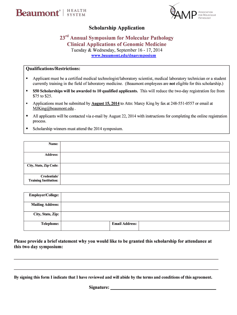 Scholarship Application 23rd Annual Symposium for Molecular Pathology Clinical Applications of Genomic Medicine Tuesday & Wednesday, September 16 17, 2014 www.beaumont.edu/dnasymposium Qualifications/Restrictions: