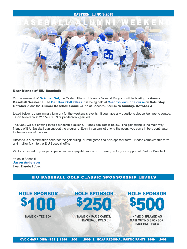 EASTERN ILLINOIS 2015 BASEBALL ALUMNI WEEKEND Dear friends of EU Baseball: On the weekend of October 34, the Eastern Illinois University Baseball Program will be hosting its Annual Baseball Weekend.