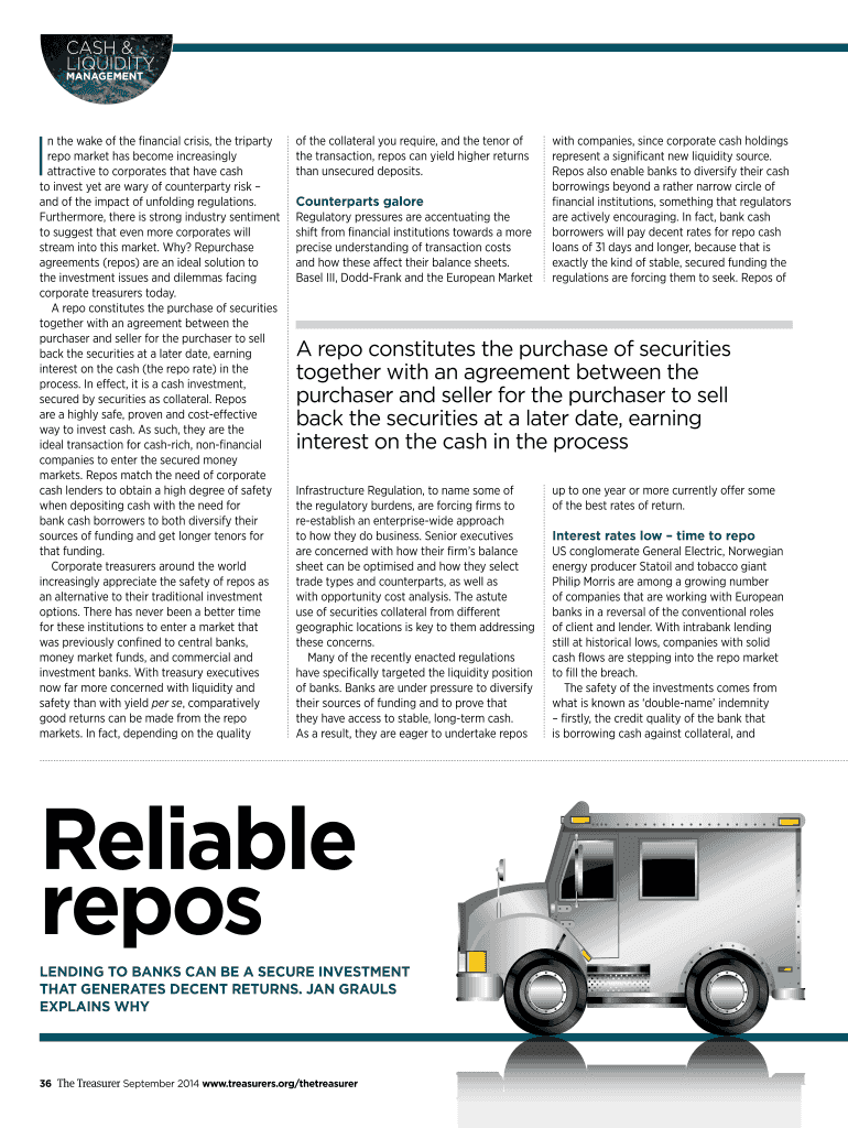 CASH & LIQUIDITY MANAGEMENT In the wake of the financial crisis, the trip arty repo market has become increasingly attractive to corporates that have cash to invest yet are wary of counterparty risk
