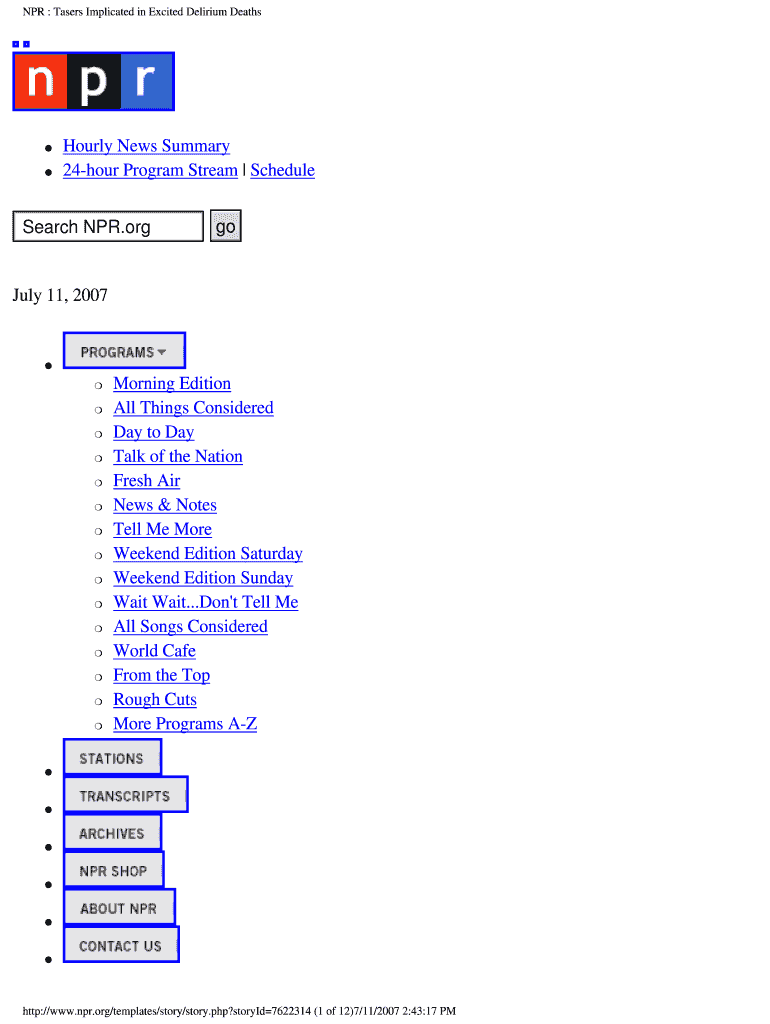 NPR : Tasers Implicated in Excited Delirium Deaths q Hourly News Summary 24hour Program Stream Schedule Search NPR.org go July 11, 2007, q r r r r r r r r r r r r r r r Morning Edition All Things