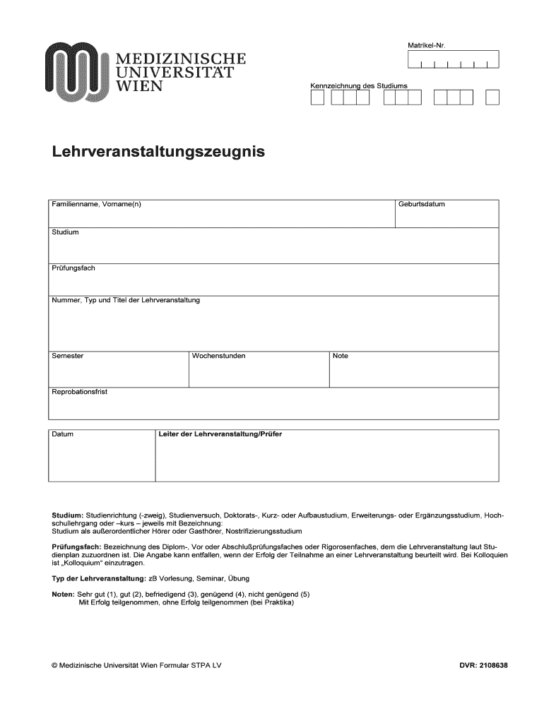 Medizinische University Wain MatrikelNr. Kennzeichnung DES Stadiums Lehrveranstaltungszeugnis Familienname, Surname(n) Geburtsdatum Stadium Prfungsfach Number, Top UND Title her Lehrveranstaltung