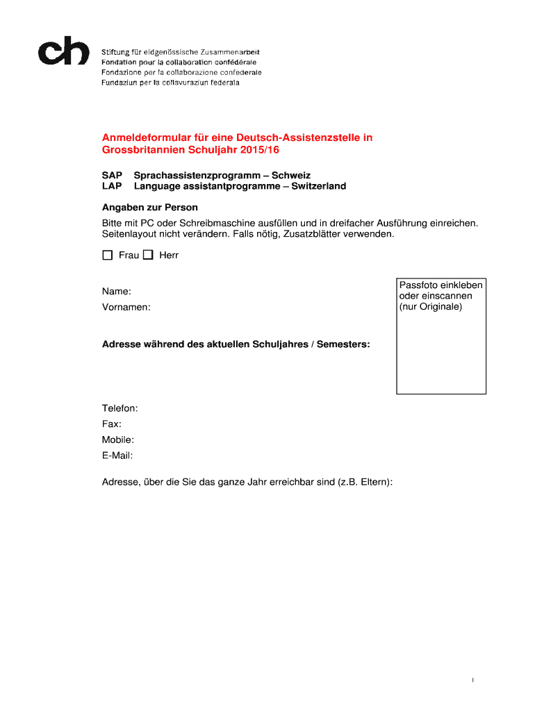 Anmeldeformularlar for and Debts for and DeutschAssistenzstelle in e chassis Grossbritannien Schuljahrahr 2015/ 2015/16 Britannia Schultz SAP LAP Sp prachassist tenzprogra AMM Schwa was La Grammy