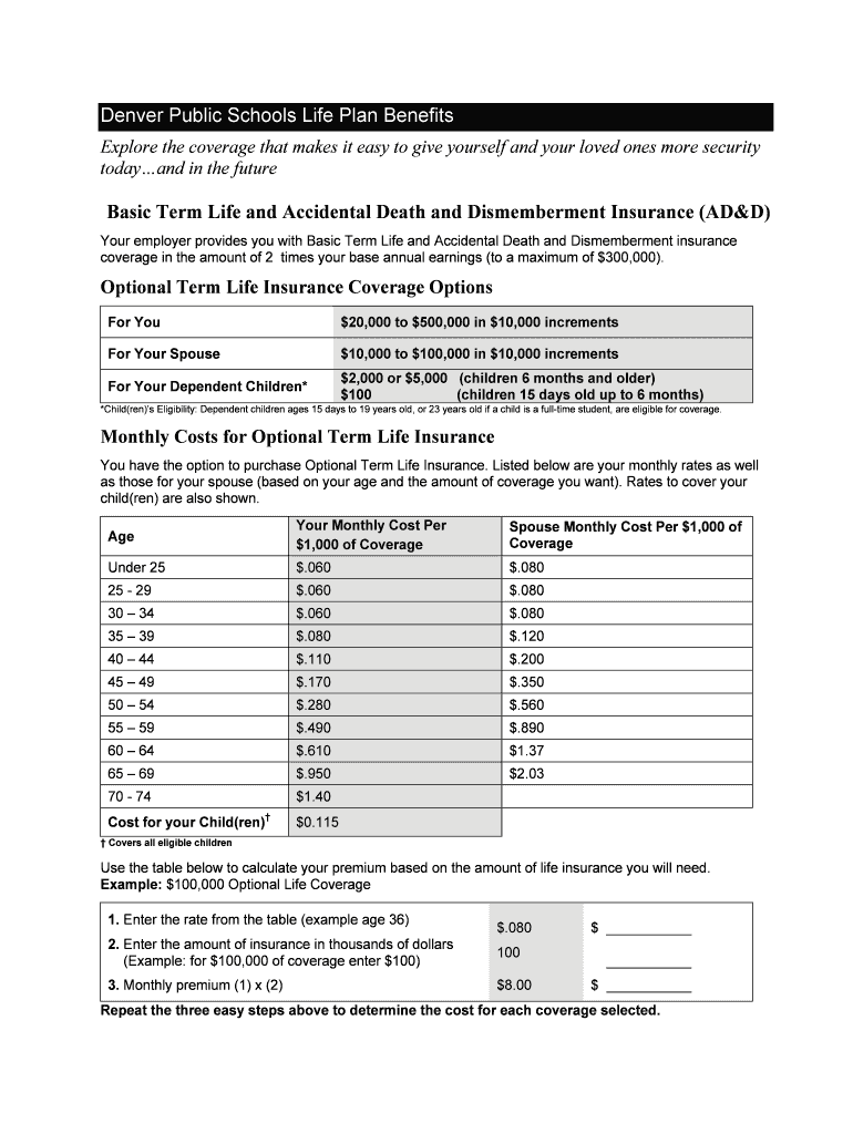 Denver Public Schools Life Plan Benefits Explore the coverage that makes it easy to give yourself and your loved ones more security today and in the future Basic Term Life and Accidental Death and