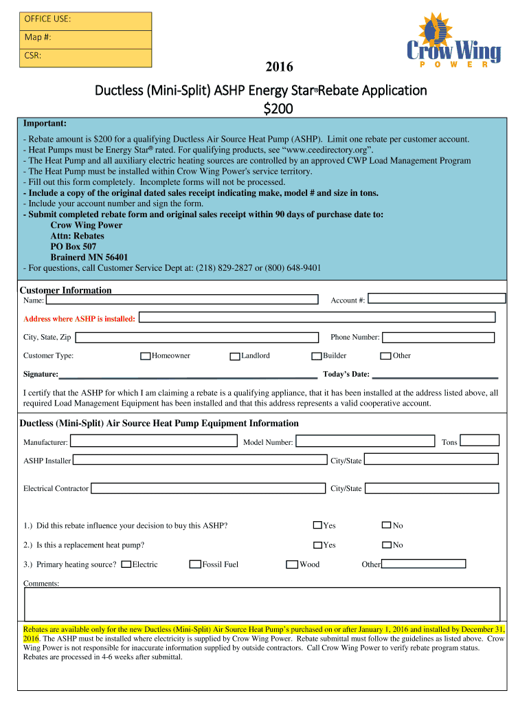 OFFICE USE: Map #: CSR: 2016 Ductless (Minimalist) ASH Energy Star Rebate Application $200 Important: Rebate amount is $200 for a qualifying Ductless Air Source Heat Pump (ASH). Limit one rebate per