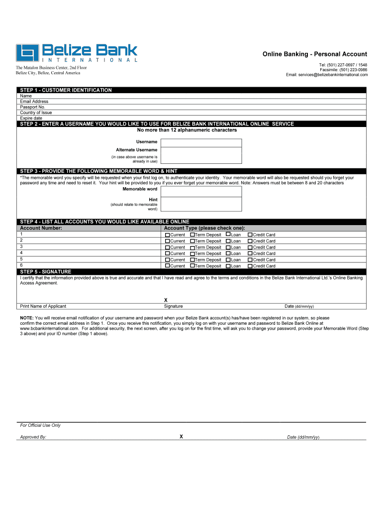 Online Banking Personal Account Tel: (501) 2270697 / 1548 Facsimiles: (501) 2230986 Email: services belizebankinternational.com The Matalon Business Center, 2nd Floor Belize City, Belize, Central