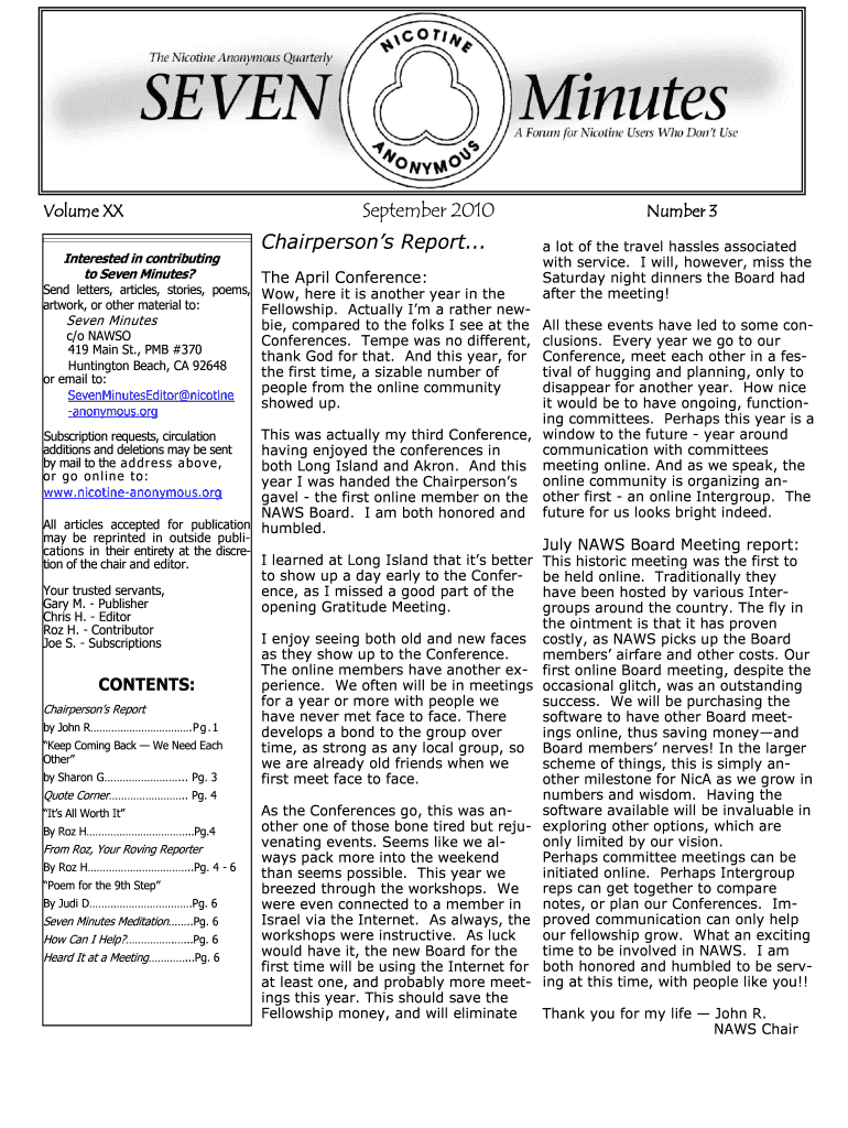 Volume XX Interested in contributing to Seven Minutes? September 2010 Chairpersons Report... The April Conference: Send letters, articles, stories, poems, Wow, here it is another year in the artwork,