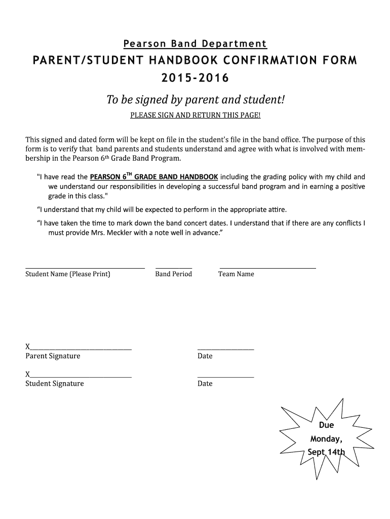 PE an r s o n B an n d D e p an r t m e n t PA R E N T/ S T U D E N T H A ND B O O K C O N F I R M AT I O N F O R M 20152016 To be signed by parent and student! PLEASE SIGN AND RETURN THIS PAGE! This