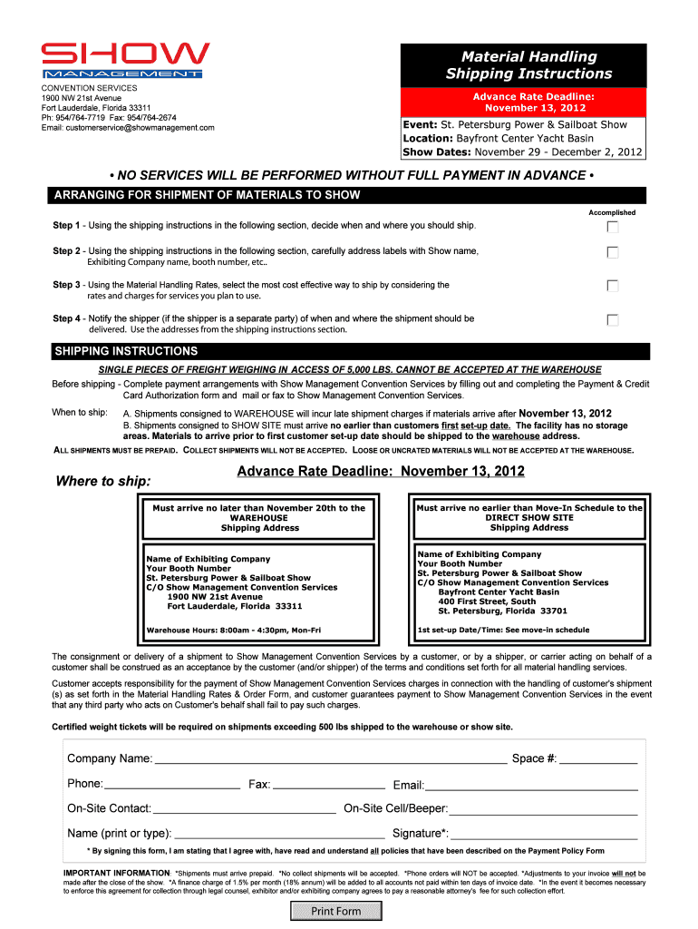 Material Handling Shipping Instructions CONVENTION SERVICES 1900 NW 21st Avenue Fort Lauderdale, Florida 33311 pH: 954/7647719 Fax: 954/7642674 Email: customer service showmanagement.com Advance Rate