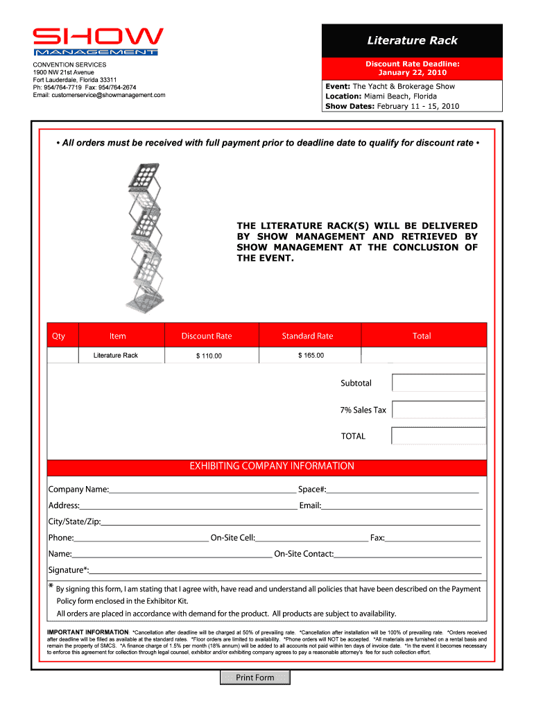 Literature Rack Discount Rate Deadline: January 22, 2010, CONVENTION SERVICES 1900 NW 21st Avenue Fort Lauderdale, Florida 33311 pH: 954/7647719 Fax: 954/7642674 Email: customer service showmanagement.com