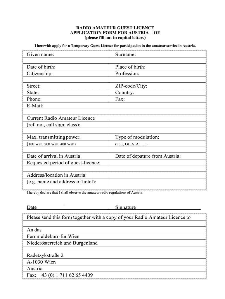 RADIO AMATEUR GUEST License APPLICATION FORM FOR AUSTRIA OE (please fill out in capital letters) I herewith apply for a Temporary Guest License for participation in the amateur service in Austria.