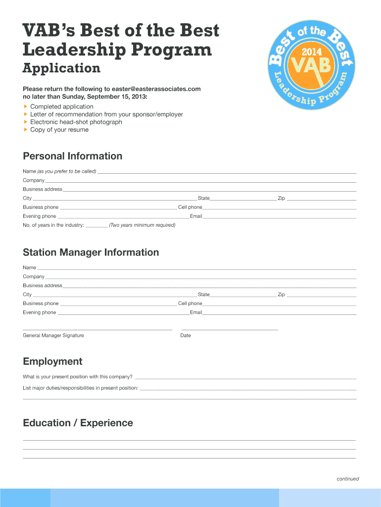 Labs Best of the Best Leadership Program Application Please return the following to Easter easterassociates.com no later than Sunday, September 15, 2013: Completed application Letter of recommendation