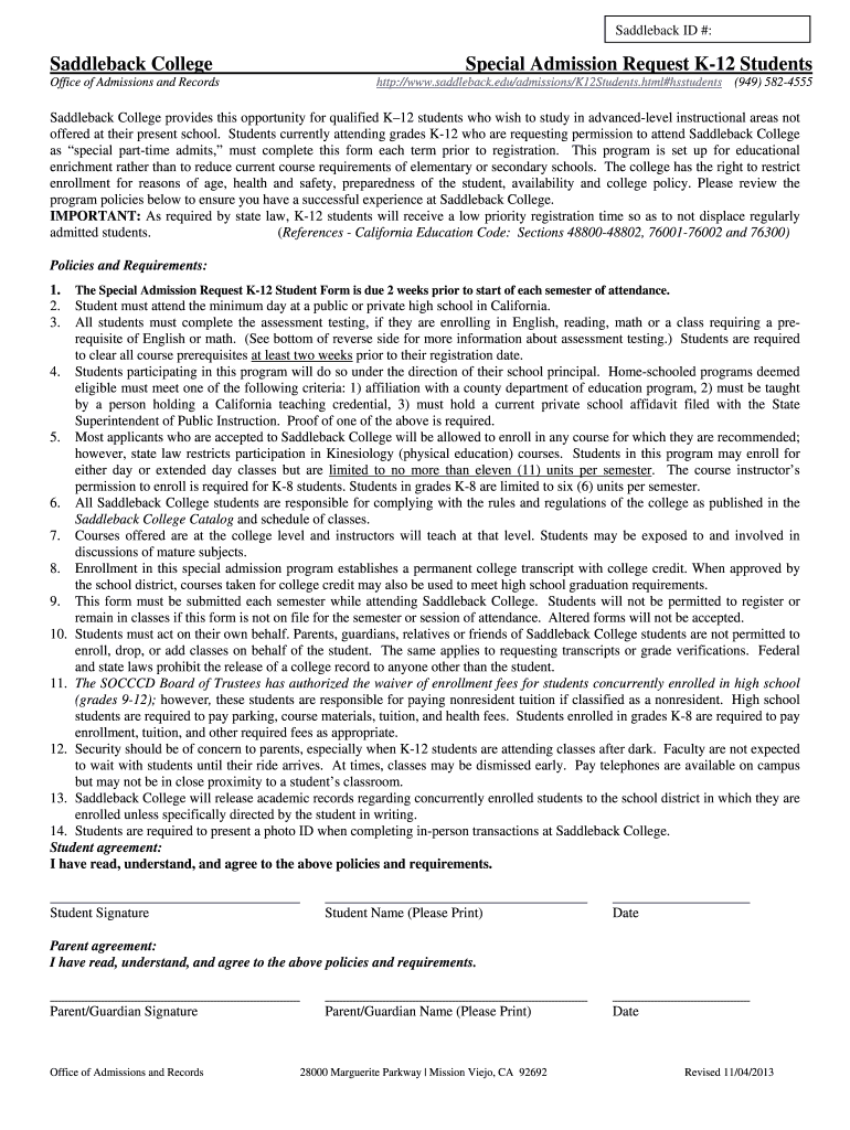 Get the free Saddleback College Special Admission Request K-12 Students