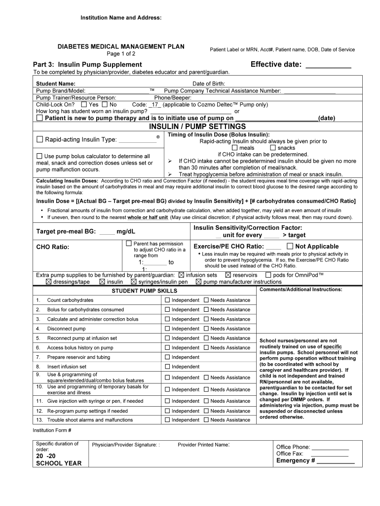 Institution Name and Address: DIABETES MEDICAL MANAGEMENT PLAN Patient Label or MAN, Acct#, Patient name, DOB, Date of Service Page 1 of 2 Effective date: Part 3: Insulin Pump Supplement To be completed