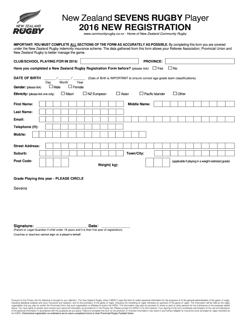 New Zealand SEVENS RUGBY Player 2016 NEW REGISTRATION www.communityrugby.co.nz Home of New Zealand Community Rugby IMPORTANT: YOU MUST COMPLETE ALL SECTIONS OF THE FORM AS ACCURATELY AS POSSIBLE.