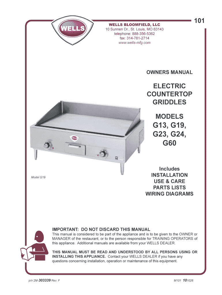 101 WELLS BLOOMFIELD, LLC 10 Sunken Dr., St. Louis, MO 63143 telephone: 8883565362 fax: 3147812714 www.wellsmfg.com OWNERS MANUAL ELECTRIC COUNTERTOP GRIDDLES MODELS G13, G19, G23, G24, G60 Includes