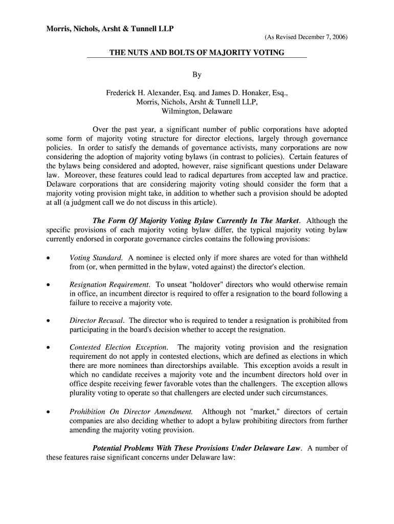 Morris, Nichols, Art & Tunnel LLP (As Revised December 7, 2006) THE NUTS AND BOLTS OF MAJORITY VOTING By Frederick H. Alexander, Esq. And James D. Honker, Esq., Morris, Nichols, Art & Tunnel LLP,