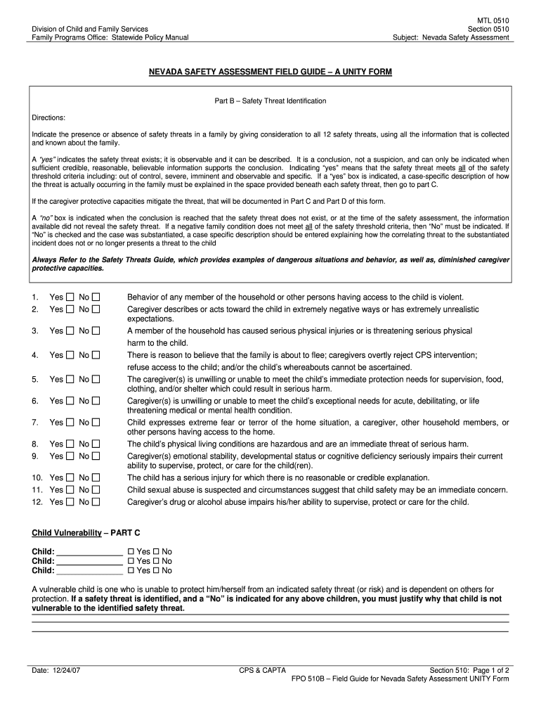 MTL 0510 Section 0510 Subject: Nevada Safety Assessment Division of Child and Family Services Family Programs Office: Statewide Policy Manual NEVADA SAFETY ASSESSMENT FIELD GUIDE A UNITY FORM Part
