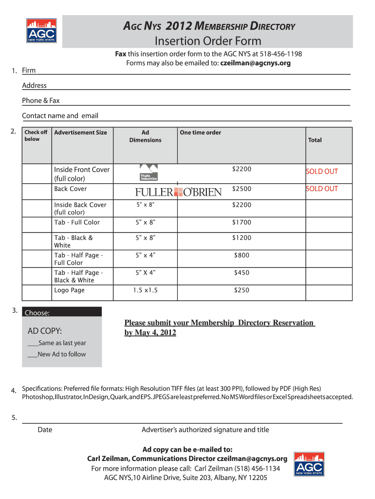 AGC NYS 2012 MEMBERSHIP DIRECTORY Insertion Order Form Fax this insertion order form to the AGC NYS at 5184561198 Forms may also be emailed to: chairman agents.org 1. Firm Address Phone & Fax Contact