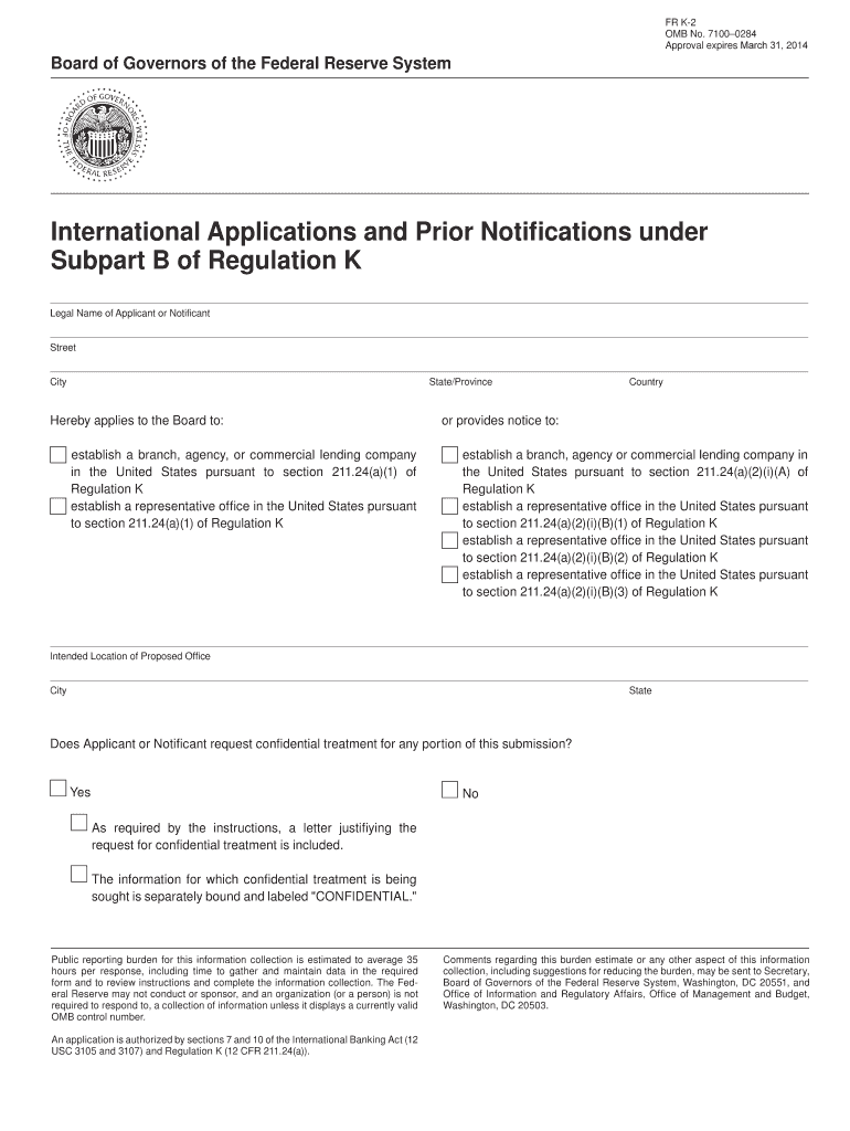 This document serves as an application for foreign banks seeking to establish a branch, agency, or commercial lending company in the United States under Regulation K, including provisions for notifications