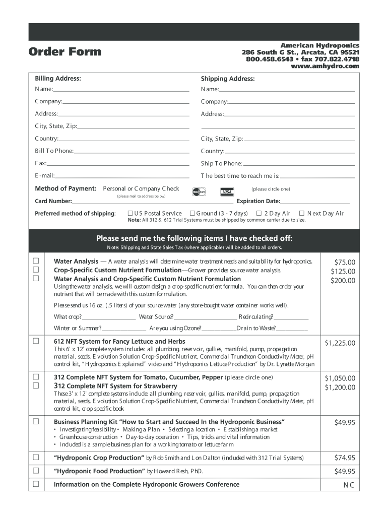 American Hydroponics 286 South G St., Arcade, CA 95521 800.458.6543 fax 707.822.4718 www.amhydro.com Order Form Billing Address: Shipping Address: Name: Name: Company: Company: Address: Address: City,