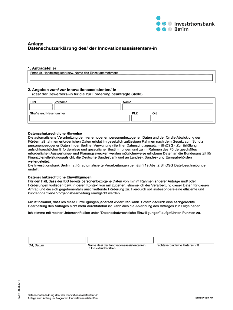 Engage Datenschutzerklrung DES/ her Innovationsassistenten/in 1. Antragsteller Firm (Lt. Handelsregister) BMW. Name DES Einzelunternehmens 2. Annabel sum/ our Innovationsassistenten/in (DES/ her Berbers/in