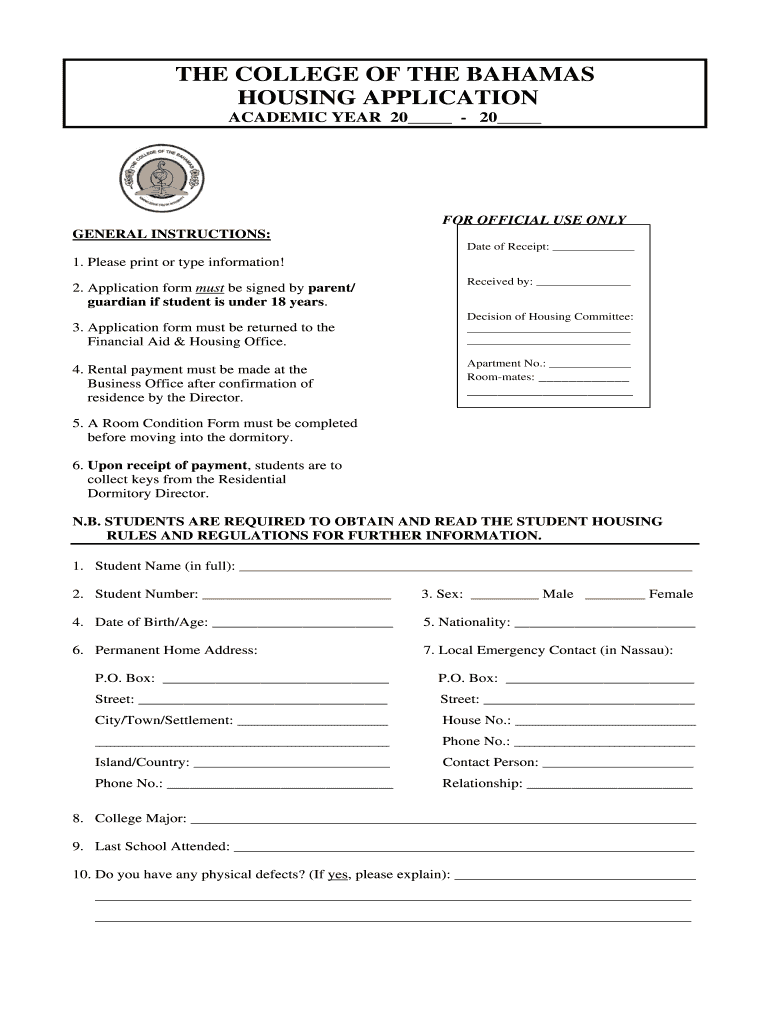 THE COLLEGE OF THE BAHAMAS HOUSING APPLICATION ACADEMIC YEAR 20 20 FOR OFFICIAL USE ONLY GENERAL INSTRUCTIONS: Date of Receipt: 1. Please print or type information! 2. Application form must be signed