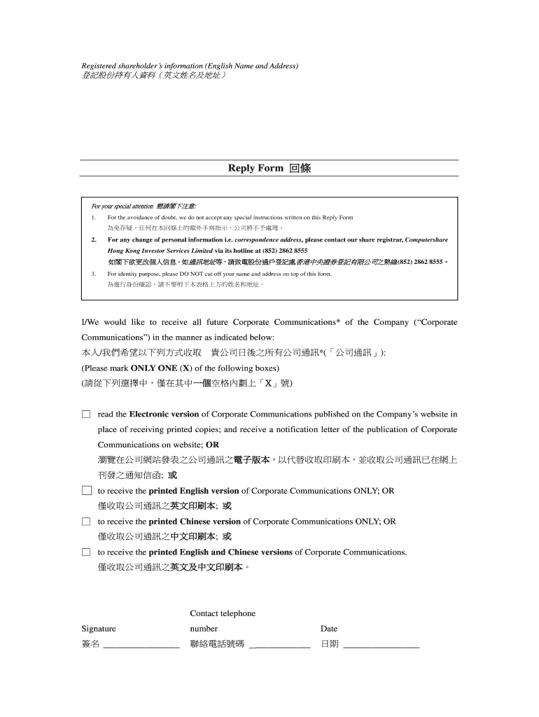 Registered shareholders' information (English Name and Address) Reply Form For your special attention : 1. For the avoidance of doubt, we do not accept any special instructions written on this Reply