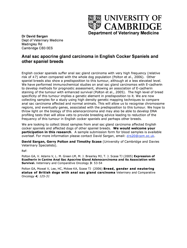 Dr David Sagan Dept of Veterinary Medicine Mainly Rd Cambridge CB3 0ES Department of Veterinary Medicine Anal sac apocrine gland carcinoma in English Cocker Spaniels and other spaniel breeds English