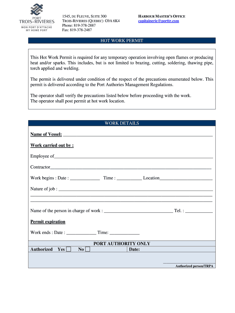 1545, DU LEAVE, SUITE 300 Trois-Rivières (QUEBEC) G9A 6K4 Phone: 8193782887 Fax: 8193782487 Harbor MASTERS OFFICE capitainerie porttr.com HOT WORK PERMIT This Hot Work Permit is required for any