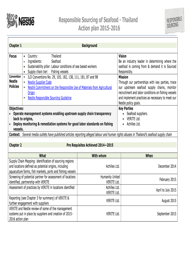 Responsible Sourcing of Seafood Thailand Action plan 2015-2016 Chapter 1 Focus Background Convention Nestle Policies Country: Thailand Ingredients: Seafood Sustainability pillar: Labor conditions