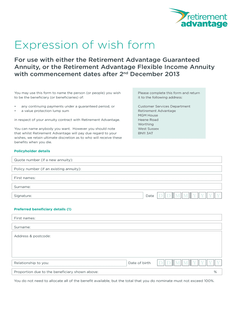 Expression of wish form For use with either the Retirement Advantage Guaranteed Annuity, or the Retirement Advantage Flexible Income Annuity with commencement dates after 2nd December 2013 You may