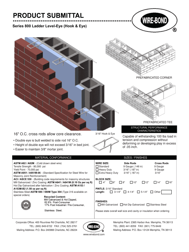 PRODUCT SUBMITTAL Series 800 Ladder Leveled (Hook & Eye) PREFABRICATED CORNER PREFABRICATED TEE Email Form Print Form STRUCTURAL PERFORMANCE CHARACTERISTICS 16 O.C. cross rods allow core clearance.