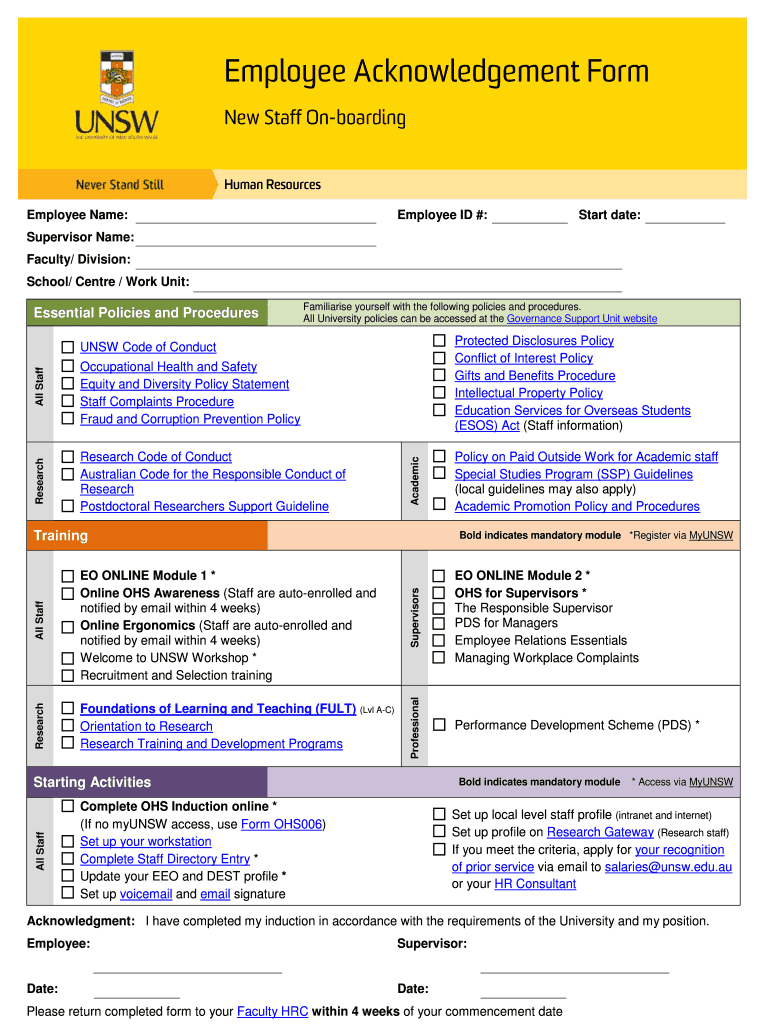 Employee Acknowledgement Form New Staff Onboarding Human Resources Employee Name: Employee ID #: Start date: Supervisor Name: Faculty/ Division: School/ Center / Work Unit: Essential Policies and