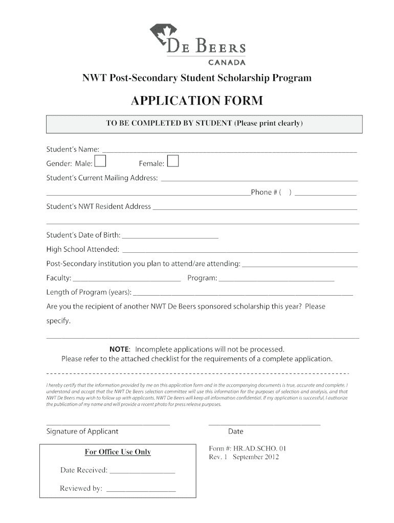De Beers Canada 2012 NWT Scholarship Program Shape Your Future in Mining NWT Office Suite 300, 510250th Avenue Yellowknife, NT X1A 3S8 Application Form De Beers Canada NWT PostSecondary Scholarship