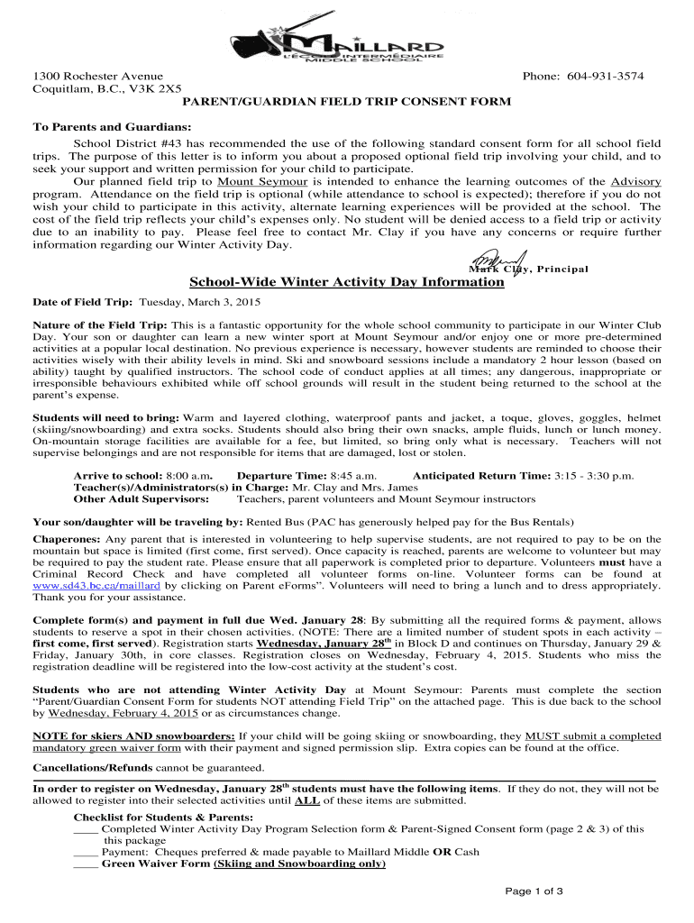 1300 Rochester Avenue Coquitlam, B.C., V3K 2×5 Phone: 6049313574 PARENT/GUARDIAN FIELD TRIP CONSENT FORM To Parents and Guardians: School District #43 has recommended the use of the following standard
