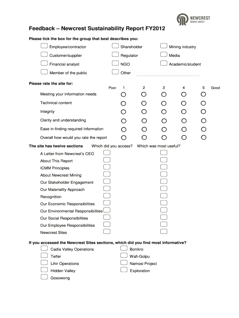 How to Fill Out Feedback Newcrest Sustainability Report: